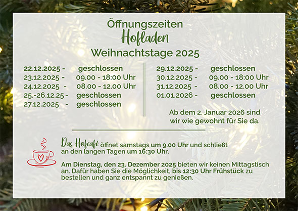 Zu unserem Biohof gehören ein großer Hofladen mit Metzgerei, Käsetheke, Bäckerei, Obst- und Gemüsebereich sowie ein Hofcafé. Unsere Felder bewirtschaften wir nach den Richtlinien des ökologischen Landbaus. Auch unsere Tierhaltung unterliegt diesen Anforderungen, wodurch eine artgerechte Haltung garantiert ist.